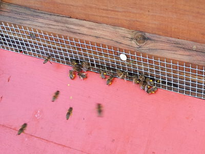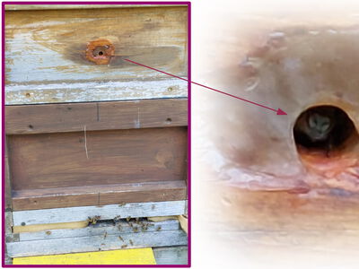 06/2024 Petra Wink: Vor Jahren klopfte ein Specht eine Öffnung in diese Zarge. Das Loch wurde verschlossen. Dieses Jahr haben die Bienen nun einen VIP-Eingang mit Wächterbiene eröffnet. Der Lieferanteneingang ist weiterhin unten.