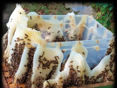 09/2022 Klaus Hinsberger: Die Bienen bauten sich einen Zugang zum Futtertrog. Leider kommt dieses Kunstwerk für die "documenta 15" in Kassel zu spät.