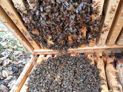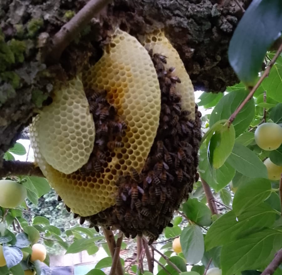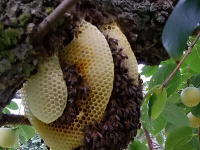 10/2023 Peter Herrmann: Bienenschwarm wurde Ende Oktober nach dem Blätterfallen in einem Busch entdeckt.