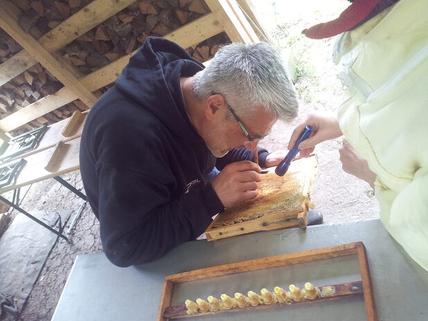 Für die Bienenjäger beginnt die Saison mit der Auswahl guter Völker, von denen nachgezogen werden soll. Im nächsten Schritt bereitet man die Zuchtlatte vor und hängt diese vor dem Umlarvtermin in den speziell vorbereiteten Sammelbrutableger. Bestreicht man die Zuchtlatte dabei mit Honig, dann lecken die Bienen den Honig ab und die Zuchtlatte nimmt den typischen Volksgeruch an. Alles für eine gute Annahme der Larven nach dem Umlarven...