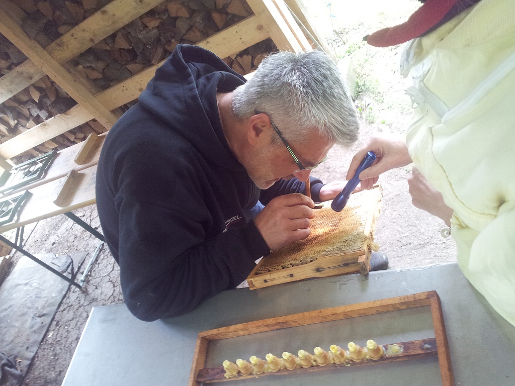Beim Umlarven selbst entnimmt man dem zur Nachzucht ausgewählten Volk eine Brutwabe mit offener Brut und setzt Larven mit einem Alter von einem Tag von der Wabe in die Näpfchen auf der Zuchtlatte um. Da die Larven sehr klein und empfindlich sind, ist hierbei eine ruhige Hand und "gewusst wie" gefragt - ein Job für Profis mit Erfahrung.