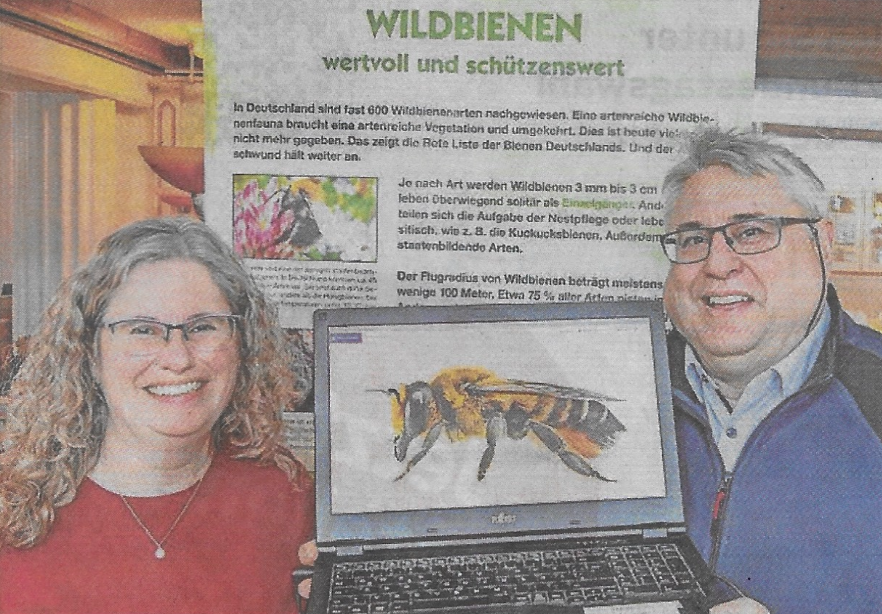 Das Kuratorium „Wildbiene des Jahres" des Arbeitskreises Wildbienen-Kataster hat die Garten-Blattschneiderbiene gekürt. Diese Wildbienenart beeindruckt durch ihre außergewöhnliche Nestbauweise: Die Weibchen schneiden mit ihren Kiefern ovale Blattstücke ab, um ihre Brutzellen damit auszukleiden. Die Weibchen transportieren den Pollen in ihrer orangeroten „Bauchbürste". Die Männchen besitzen auffällig verbreiterte Vorderbeine, die bei der Paarung eine entscheidende Rolle spielen. Diese werden weiße Fausthandschuhe" genannt und dienen der Ubertragung von Duftstoffen während der Paarung.