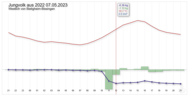 Der Schwarm ging von unserem Stockwaagen-Volk ab, daher hatten wir es sofort bemerkt. Eine Tagesbilanz von -6,5kg, da weiß man was los ist. Morgens zwischen 10 Uhr und 11 Uhr zog er aus und war beachtliche 6,4 kg schwer. Interessanterweise hat sich das "Rest-Volk" auf der Waage recht schnell beruhigt und zwei Tage später schon wieder 1,4 kg Nektar gesammelt (...trotz kühlem Wetter).