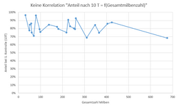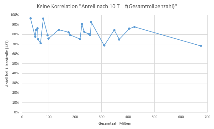 Der erste Blick auf die Daten ließ vermuten, dass die Summe der Gesamtmilbenzahl auch einen Einfluss auf den Anteil der gefallenen Milben bei der ersten Kontrolle hatte. Die Analyse der Daten bestätigte dieses nicht - eine Korrelation zwischen der Gesamtzahl der gefallenen Milben und dem prozentualen Anteil der gefallenen MIlben bei der ersten Kontrolle war nicht erkennbar.