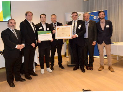 Gewinner des European Bee Award (EcoCut) zusammen mit Vertretern der Jury. Von links: MEP Paulo do Nascimento Cabral (EPP), Dieter Reber (EcoCut), Prof. Dr. Reiner Beutel (EcoCut), Gilles Dryancour (John Deere, Mitglied der Jury), Matthias Reber (EcoCut), Thierry de l’Escaille (ELO, Mitglied der Jury), Prof. Dr. Michael Garratt (Universität Reading, Vorsitzender der Jury) -