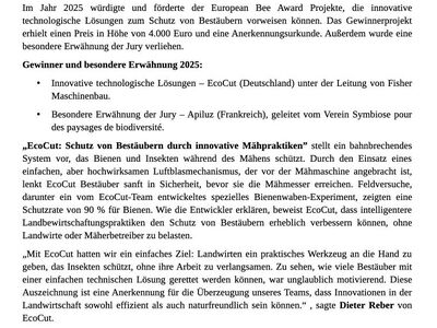 Firma Fischer Maschinenbau aus Gemmrigheim erhält für die insektenfreundliche EcoCut-Mähtechnik den European Bee Award 2025 und hat sich damit gegen 28 internationale Bewerber durchgesetzt. Bei dieser Mähtechnik werden die Insekten mit einem Gebläse vor der Mähmaschine seitlich weg geblasen.