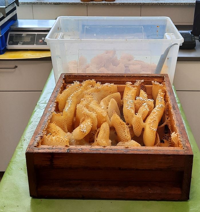 Wir haben das aktuell warme Wetter dazu genutzt, die eingegangenen Völker abzuräumen und dann war natürlich das "Ausräumen" der Futtermagazine angesagt. Eine riesen Sauerei. Wir brauchten rund eine halbe Stunde für jedes Futtermagazin und danach klebte am Arbeitstisch alles.
