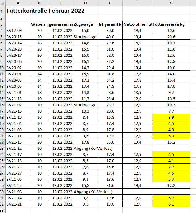 Die hier gezeigte Tabelle gilt nur für unsere Leergewichte. Das kann sich bei anderen Beuten drastisch unterscheiden!