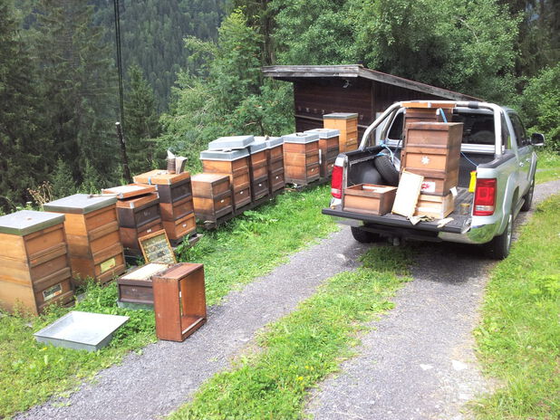 Um den Bienen eine unberührte Natur fernab von industrialisierter Landwirtschaft bieten zu können, sind wir wieder ins Paznauntal gewandert und haben die Völker dort auf über 1000 Meter Höhe an blühenden Almwiesen aufgestellt. Da das Frühjahr dieses Jahr auch in Österreich eine feucht-nasse Angelegenheit war, kam dort der Frühling erst richtig in Gang, als wir Anfang Juni aufwanderten.