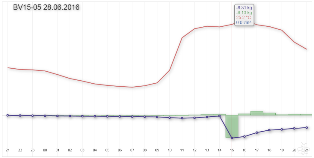 Mit großer Freude haben wir daher die täglichen positiven Meldungen der Stockwaage verfolgt - bis zum Tage X. An jenem Tag meldete die Stockwaage um 21 Uhr plötzlich eine deutlich negative Tagesbilanz. Stutzig geworden, haben wir die Stundenwerte des Tages der Penso-Waage gesichtet und mussten feststellen, dass das Stockwaagen-Volk innerhalb einer Stunde um 6,3kg abgenommen hatte.
