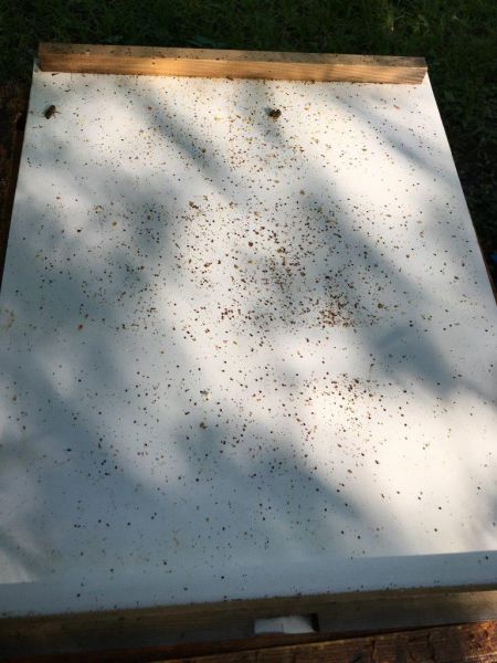 Ich habe 9 Völker kontrolliert und bei 8 Völkern nahezu keine Milben gefunden. Aber wie es häufig der Fall ist, gab es mal wieder einen Ausreißer. Die "Milbenschleuder" hatte schon nach 1,5 Tagen massig Milben auf dem Bodenschieber. Ich habe sie nicht gezählt, aber das dürfen nach meiner Einschätzung rund 500...600 gewesen sein (siehe Bild).