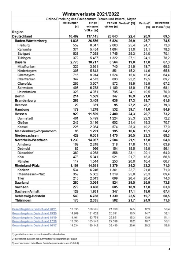Auf der Basis von mehr als zehntausend Antworten lag die mittlere Verlustquote in Deutschland bei 20,9% und damit im oberen Bereich der langjährigen Schwankungsbreite. Fast 69,5% der antwortenden Imker berichteten von mehr oder weniger umfangreichen Ausfällen, ein Wert der deutlich über den Zahlen der vergangenen Jahre liegt. Die im Mittel höchsten Verluste meldeten die Imker aus Hamburg, während für Mecklenburg-Vorpommern und Bayern die niedrigsten Einbußen verzeichnet wurden.