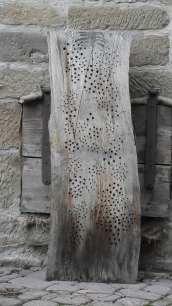 Wer jetzt denkt, das Ganze ist mit dem Bohren von ein paar Löchern getan, der irrt. Die Baumstämme werden zunächst gebohrt, danach werden die Baumstämme in einem aufwändigen Verfahren nachbehandelt, damit die Löcher ohne Spreißel und Splitter sind. Damit werden die Hotels deutlich attraktiver für Wildbienen und mit einer besseren Annahme ist zu rechnen.