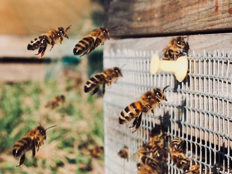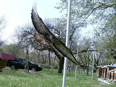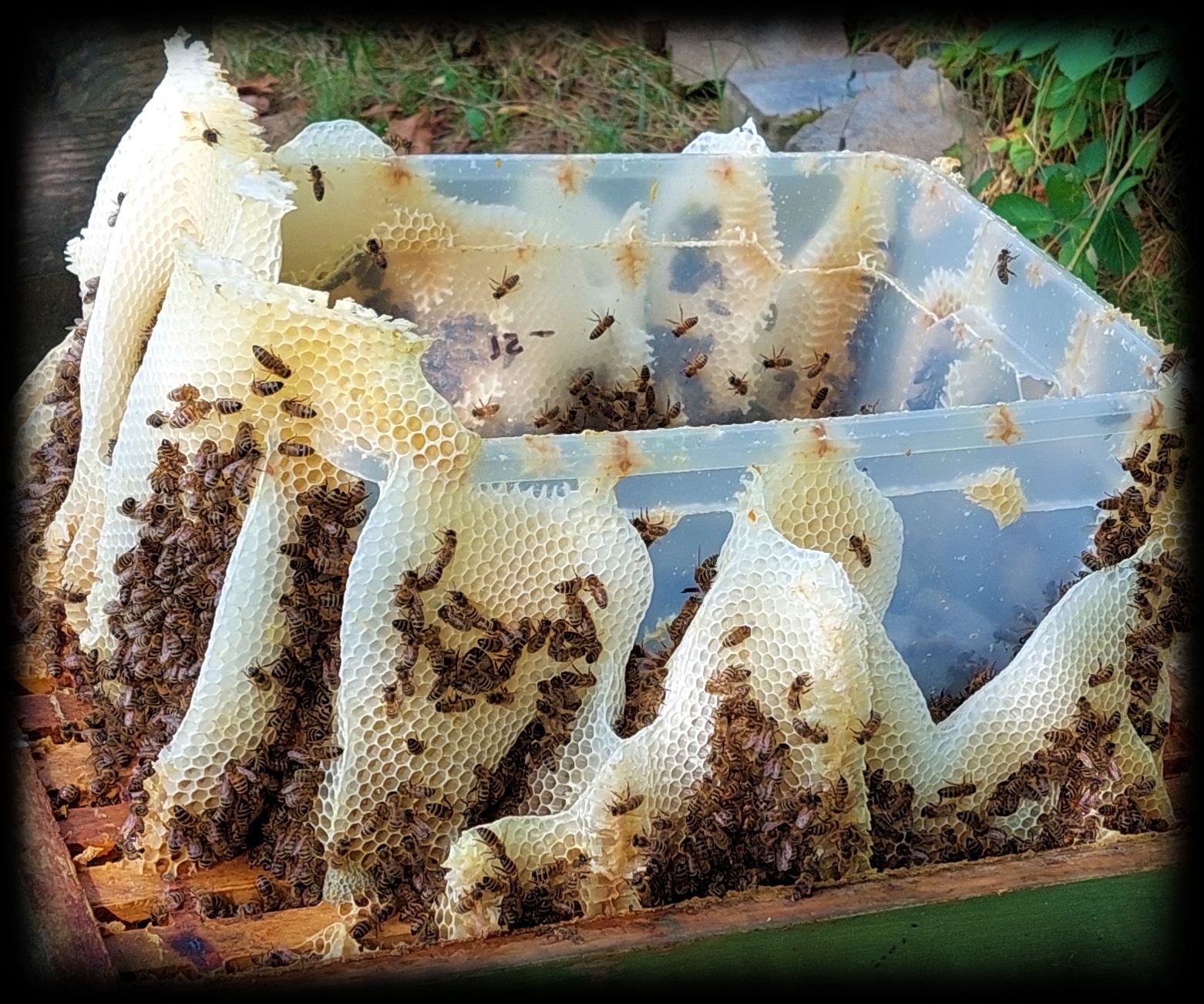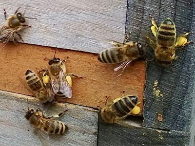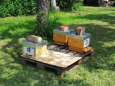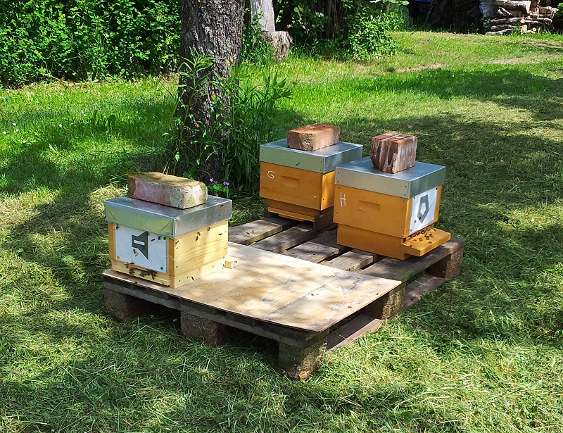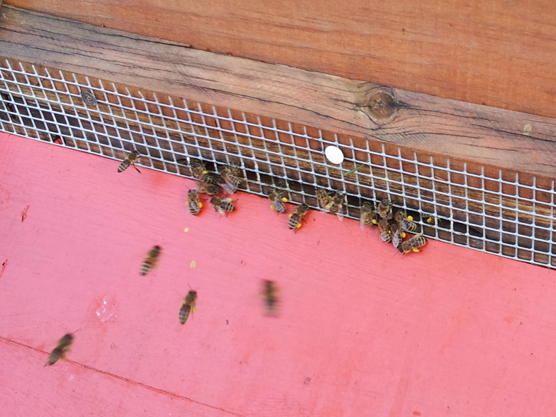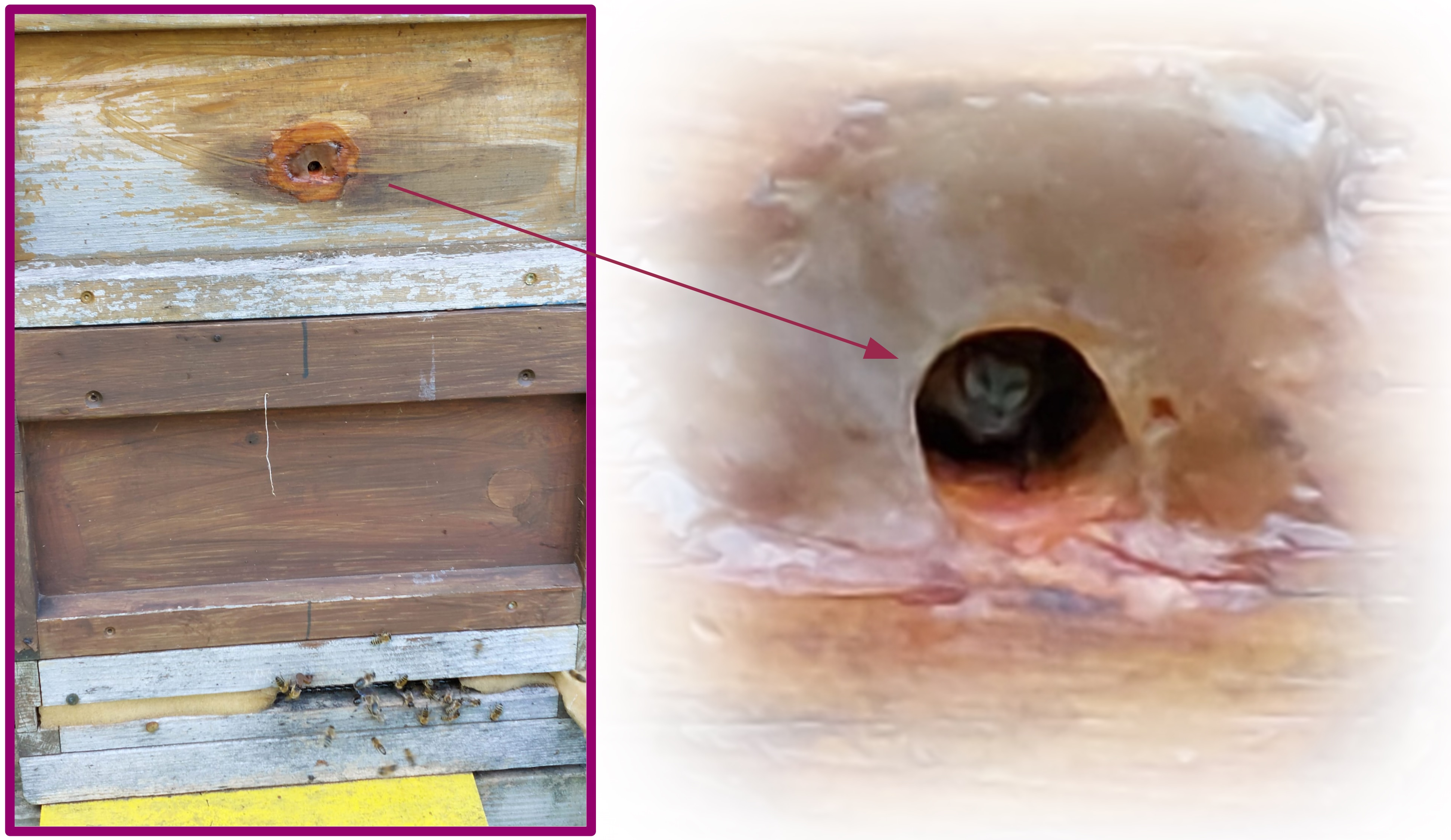 06/2024 Petra Wink: Vor Jahren klopfte ein Specht eine Öffnung in diese Zarge. Das Loch wurde verschlossen. Dieses Jahr haben die Bienen nun einen VIP-Eingang mit Wächterbiene eröffnet. Der Lieferanteneingang ist weiterhin unten. -