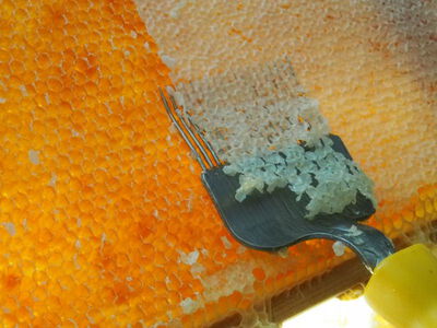 09/2022 Klaus Hinsberger: Die Bienen bauten sich einen Zugang zum Futtertrog. Leider kommt dieses Kunstwerk für die "documenta 15" in Kassel zu spät. -