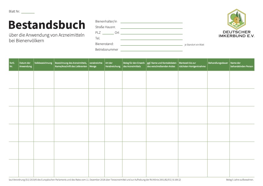 Ab dem 28. Januar 2022 müssen Erwerbs-, Nebenerwerbs-, und Hobbyimker das Anwenden aller Tierarzneimitteln in einem Bestandsbuch dokumentieren. Zu den Mitteln gehören verschreibungspflichtige, apothekenpflichtige und frei verkäufliche Präparate. Also auch, wenn wir Imker unsere Bienen mit Ameisen- und Oxalsäure gegen die Varroamilben behandeln.
