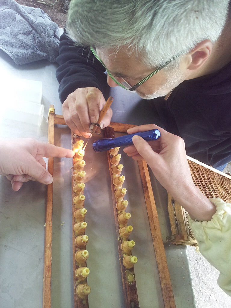 Beim Umlarven selbst entnimmt man dem zur Nachzucht ausgewählten Volk eine Brutwabe mit offener Brut und setzt Larven mit einem Alter von einem Tag von der Wabe in die Näpfchen auf der Zuchtlatte um. Da die Larven sehr klein und empfindlich sind, ist hierbei eine ruhige Hand und "gewusst wie" gefragt - ein Job für Profis mit Erfahrung.