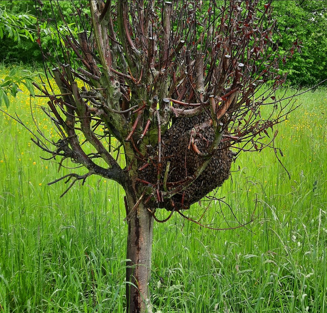 Leider bedeutet das auch, dass die Bienen nichts zu tun haben. Die Königinnen sind jetzt in Hochform und es schlüpfen jeden Tag viele junge Bienen im Volk - es kann sich aber nicht "abarbeiten", weil kein Nektar gesammelt wird. In der Folge sind die Beuten gestopft voll mit Bienen und das löst dann einen kräftigen Schwarmtrieb aus. Bei einem unserer Völker war es am 07.05.2023 soweit - ein Schwarm ging ab. Freundlicherweise hatte sich der Schwarm etwa 20 Meter vom Stand entfernt an einer Weide auf Hüfthöhe nieder gelassen, so war das einzufangen wenigstens ein Kinderspiel.