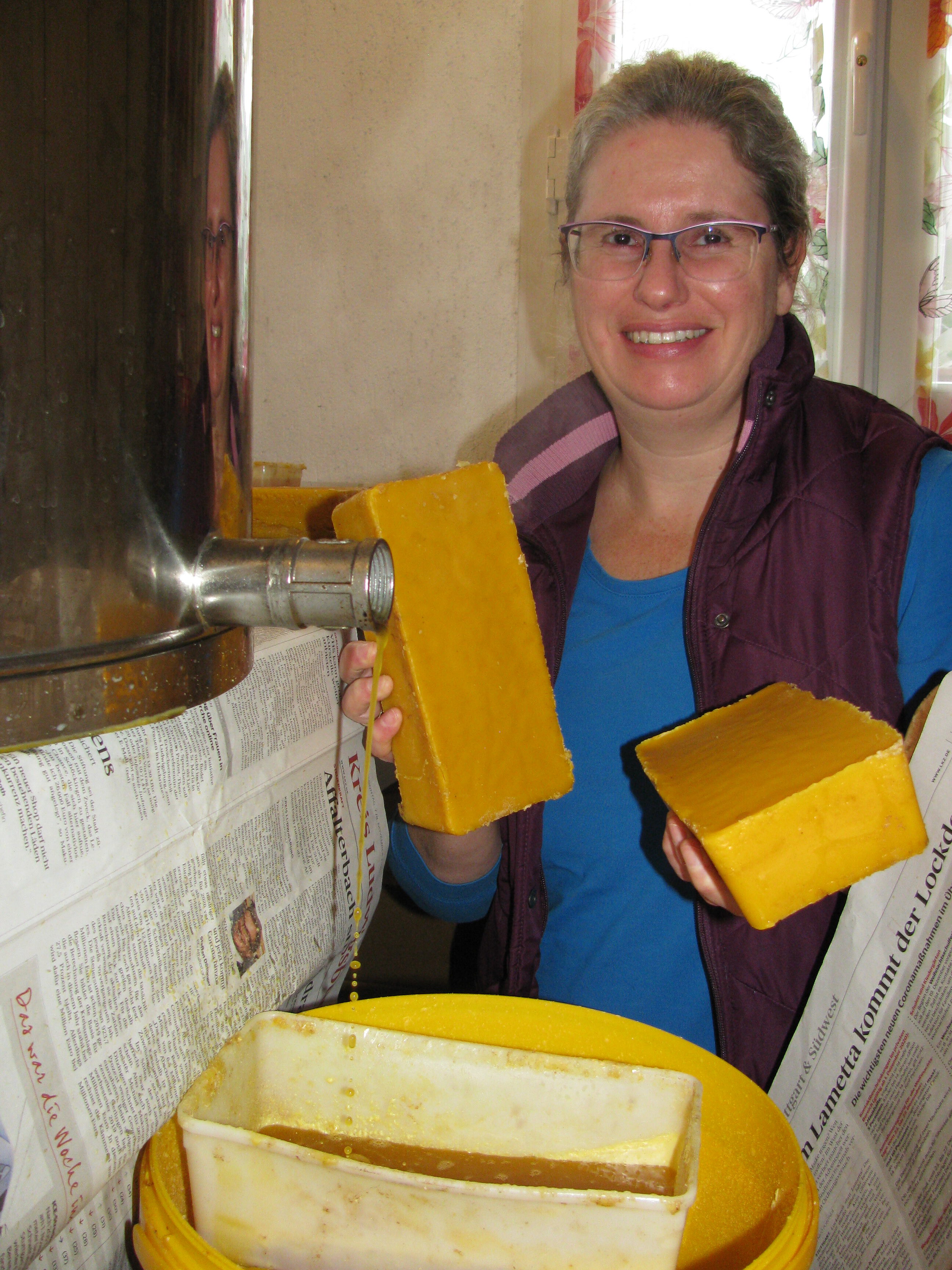 Und was passiert mit dem entnommenen Bienenwachs? Daraus können Kerzen gegossen werden berichtet Hobbyimkerin Dorothea Pulli. „Dazu schmelze ich zunächst das Wachs der alten Waben in einem Kessel mit Hilfe von heißem Dampf in ca. 500 Gramm schwere Barren“. Ein Fließ sorgt für eine grobe Reinigung des Wachses. Diese Barren müssen dann abkühlen und können aufbewahrt werden. Später werden dann diese Wachsbarren in einem Behältnis, das sich wiederum in einem heißen Wasserbad befindet, geschmolzen und das heiße Wachs in Kerzenformen gegossen. Anschließend muss man die Form mit dem Wachs abkühlen lassen und fertig ist die Bienenwachskerze. Echtes Bienenwachs bildet nach einiger Zeit eine weiß-schimmernde Schutzschicht an der Oberfläche. Dies ist ein Zeichen für