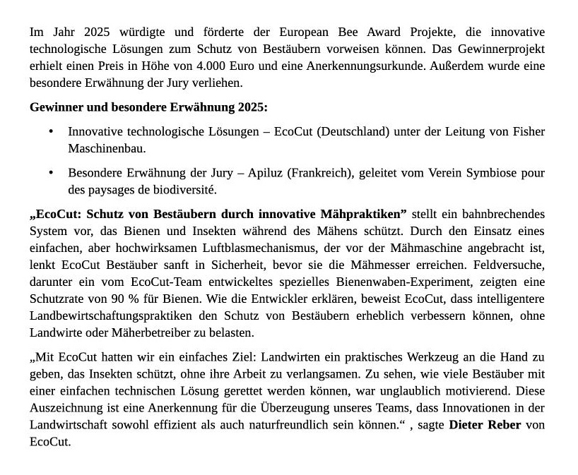 Firma Fischer Maschinenbau aus Gemmrigheim erhält für die insektenfreundliche EcoCut-Mähtechnik den European Bee Award 2025 und hat sich damit gegen 28 internationale Bewerber durchgesetzt. Bei dieser Mähtechnik werden die Insekten mit einem Gebläse vor der Mähmaschine seitlich weg geblasen.