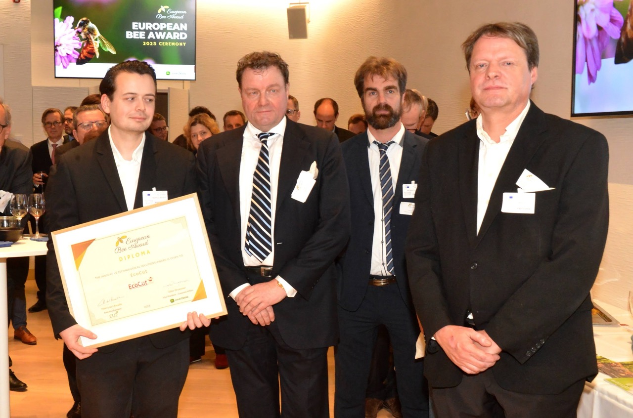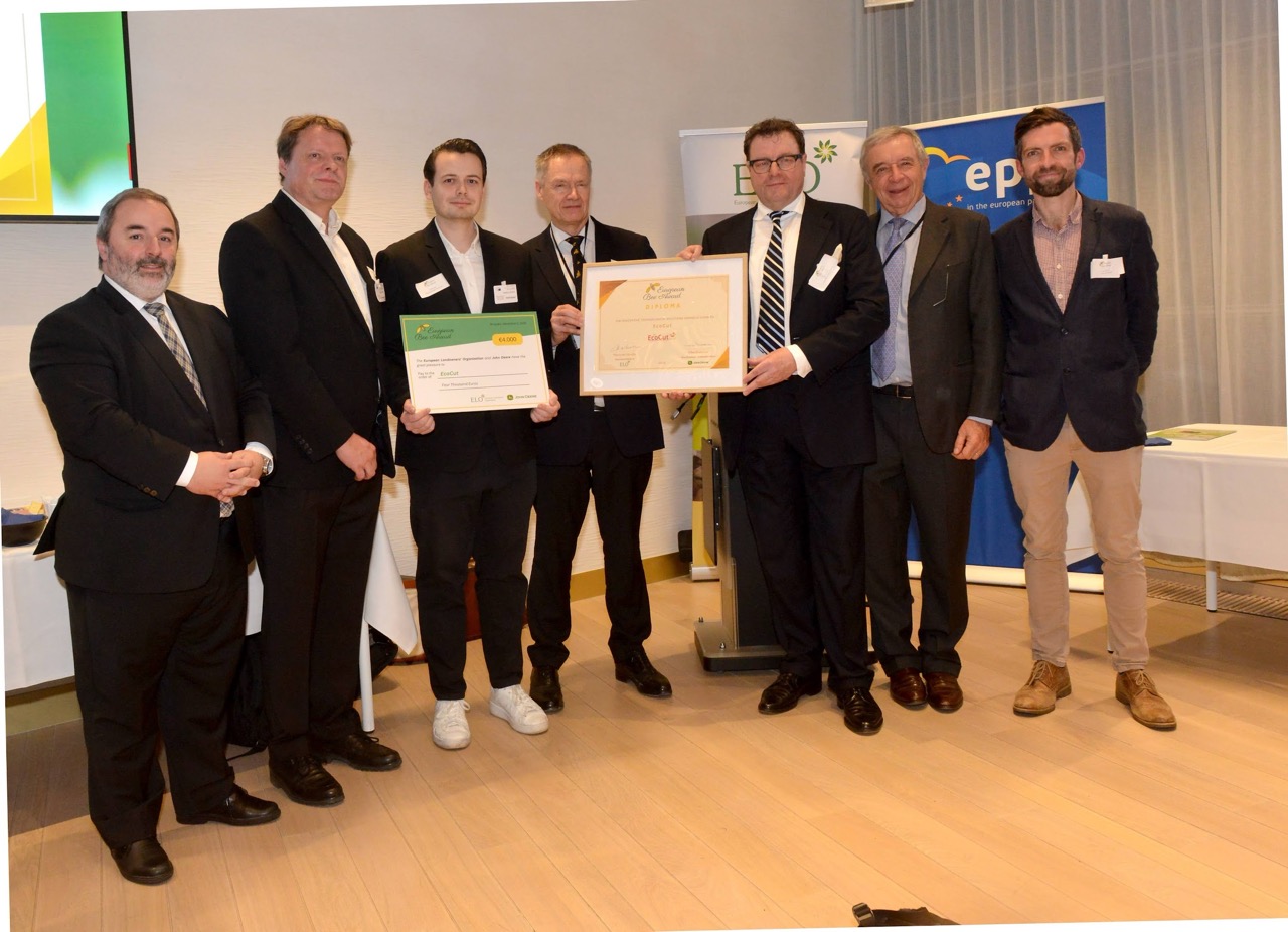 Gewinner des European Bee Award (EcoCut) zusammen mit Vertretern der Jury. Von links: MEP Paulo do Nascimento Cabral (EPP), Dieter Reber (EcoCut), Prof. Dr. Reiner Beutel (EcoCut), Gilles Dryancour (John Deere, Mitglied der Jury), Matthias Reber (EcoCut), Thierry de l’Escaille (ELO, Mitglied der Jury), Prof. Dr. Michael Garratt (Universität Reading, Vorsitzender der Jury) -