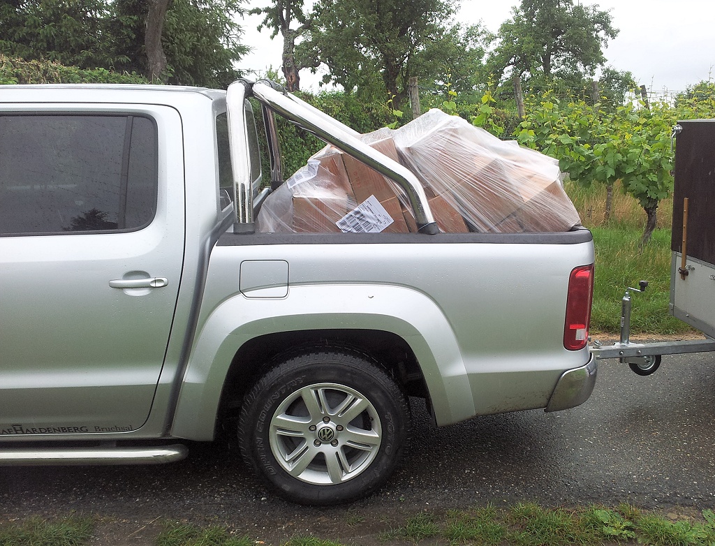 Wieder mal habe ich eine Lektion zum Thema "Ladungssicherung" gelernt. 800 kg Bienenfutter in Kartons, auf einer Euro-Palette mit Spannfolie zusammengehalten und quer auf die Ladefläche gestellt. Wer würde da vermuten, dass diese Ladung nicht sicher auf der Ladefläche steht?